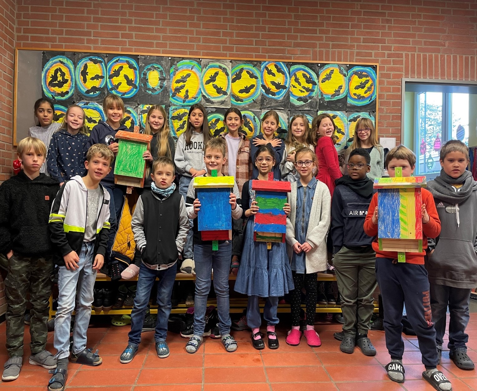 An jeweils drei Schulvormittagen wurden die Drittklässler zunächst auf das Thema eingestimmt und durften anschließend ihr handwerkliches Geschick beim Bau von Fledermauskästen unter Beweis stellen. Jedes Team gab seinem Kasten noch ein individuelles künstlerisches Design. Insgesamt wurden von den drei Klassen 20 Fledermauskästen gebaut. Drei „Winterquartiere“ wurden im Schulgarten aufgehangen, die übrigen verkaufte der Förderverein auf dem Weihnachtsmarkt in Immenhausen.