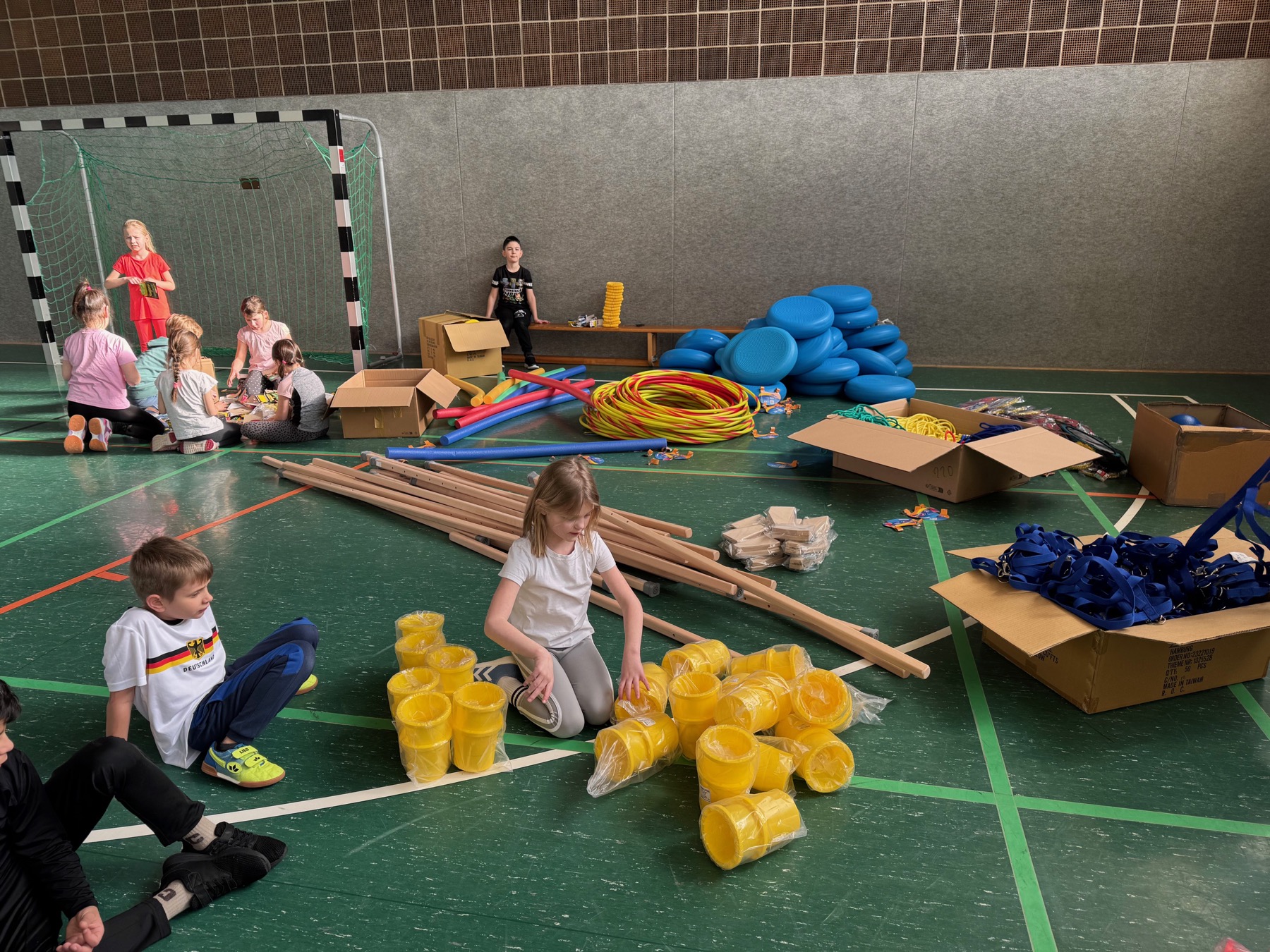 Gemeinsam mit der Rektorin durften die Kinder Ringwurfspiele, große Sanduhren, Hula-Hoop-Reifen, Gummitwist, „Pferdeleinen“, Springseile, softe Frisbees und noch einiges mehr auspacken und begutachten.